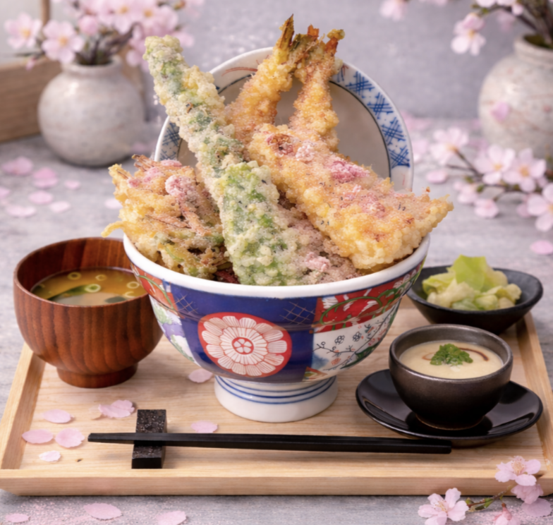 - Sakura Tendon: A seasonal tempura bowl with tiger prawns, kabocha pumpkin, chicken, asparagus, white fish, lotus root, tamagoyaki, and avocado, finished with a squid and vegetable kakiage, shiso powder, and sakura pickles.