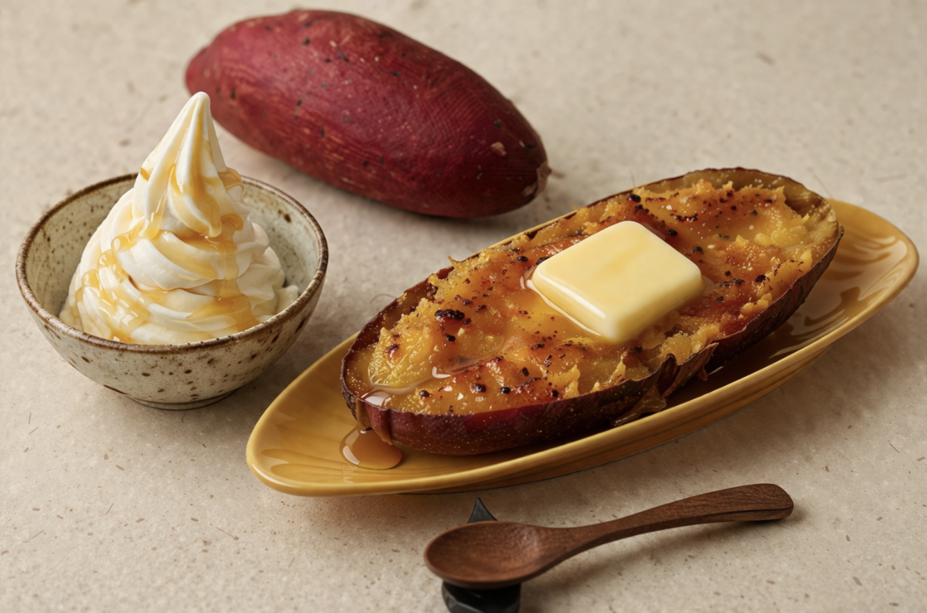 - Baked Ibaraki Sweet Potato: Japanese sweet potato baked until creamy, topped with butter and honey.